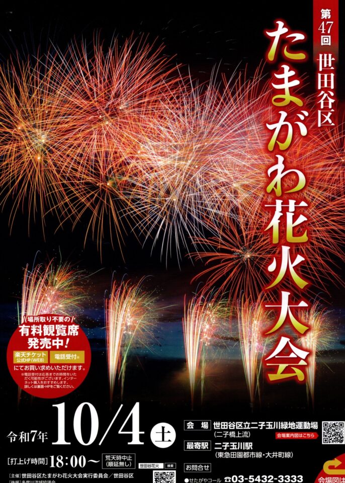 10月4日(土)雨の心配もありましたが、第47回 世田谷区たまがわ花火大会が無事に開催されました。現地には行けませんでしたが、自宅前から、ポスターそっくりの華麗な花火が鑑賞出来て、大感激です。秋花火は、空気が澄んでいることもあり、きれいに見えるとのことでしたが、時折小雨もちらほら、雲が少しかかっていることもあって、ぼやけて見えました。しかし、地を揺るがす大音響、離れている地点からでも、その迫力を堪能するできました。