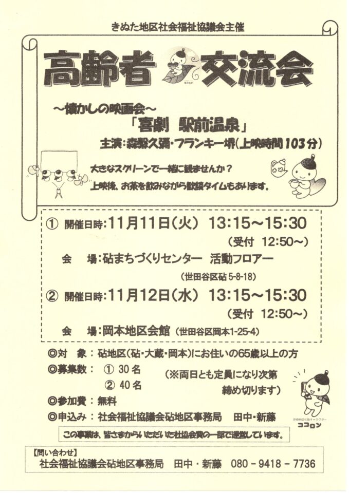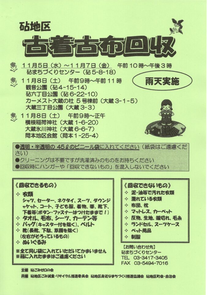 11月16日(日)砧公園で、「砧ラリー」が開催されます。広い公園内を駆け巡る、スタンプラリーです。参加した子どもたちの歓声が、響き渡ります。11月5日(水)~8日(土)までは、砧地区古着古布回収が行われます。事前回収と当日回収は、時間と回収場所が違っていますので、ご注意ください。法人格 砧町自治会会館隣りの公園、砧6丁目公園(砧6-22-10)での11月8日(土)の当日回収は、法人格 砧町自治会の理事が担当して、皆様のお越しをお待ちしています。