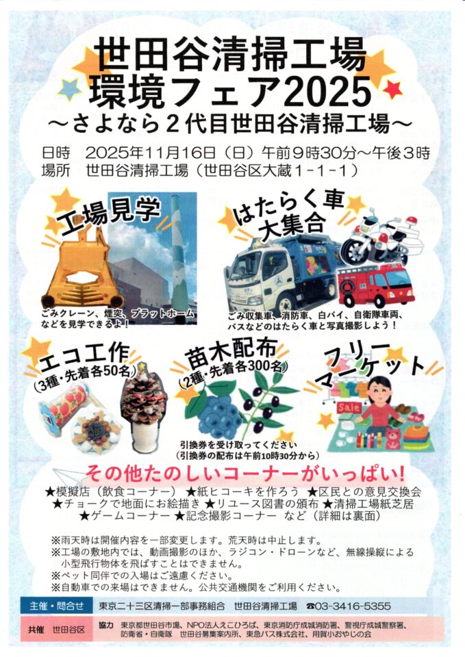 11月といえば、七五三。つい先日の10月5日(日)に、地域が盛り上がる例大祭を敢行したばかりの三峯神社(砧4-6-1)では、11月9日(日)宮司様がお祓いをしてくださるそうです。子供たちの健全な成長を願い、境内はお花で埋め尽くされるようです。その他、11月2日(日)、3日(月・祝)「日本大学商学部の砧祭 2025」(砧5-2-1)があります。若い力の総結集を実感してみてください。校内活動の紹介や、ライブ、校内スタンプラリー、ファッションショー、ビヤガーデンまであるそうです。11月2日(日)には、日赤奉仕団のフリーマーケットも出店されます。11月16日(日)は、世田谷清掃工場 環境フェア2025(世田谷区大蔵1-1-1)です。収集されたゴミの行く先を見に行きましょう。工場見学、お子様に大人気、はたらく車も見ることが出来ます。