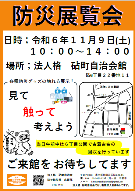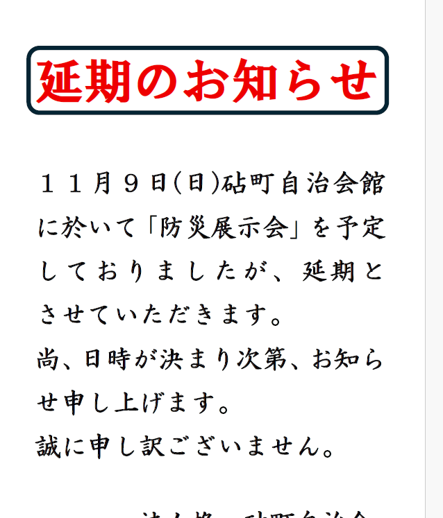 10月の回覧板でもお知らせしておりましたが、法人格 砧町自治会主催の「防災展覧会」会場設置の都合により、延期とさせていただきます。来て、見て、実際に触ってみたい!と期待して下さっていた皆さまに、残念なお知らせとなってしまいました。この展覧会は、住民レベルで、防災に対する心構えや、実際のグッズに触れていただいたり、その場所で互いに情報交換もできるという、企画です。