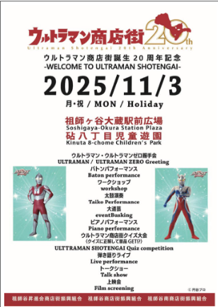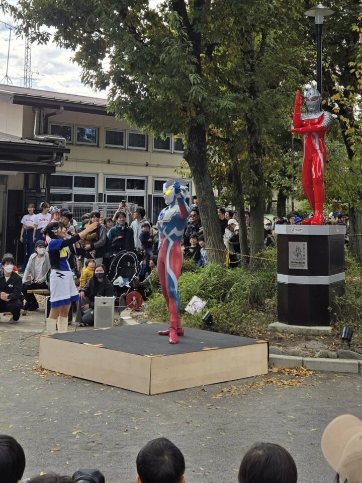 地元の商店街が元気だと、その町全体が活気づきます。我が町の商店街「ウルトラマン商店街」は、誕生から20周年となりました。11月3日(月・祝)には盛大なイベントが開催されました。会場は祖師谷大蔵駅前広場と、砧八丁目児童遊園です。日頃のお付き合いのご縁と、同じオレンジ色をテーマカラーとする、法人格 砧町自治会の理事は、ほんの少しお手伝い。八丁目児童遊園で、12:30~と16:00~の「ウルトラマンゼロ」の握手会の、会場警備・交通整理を行いました。