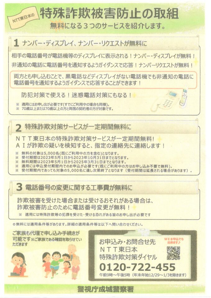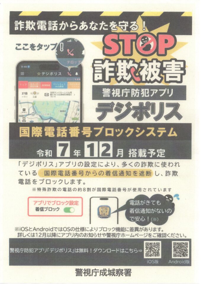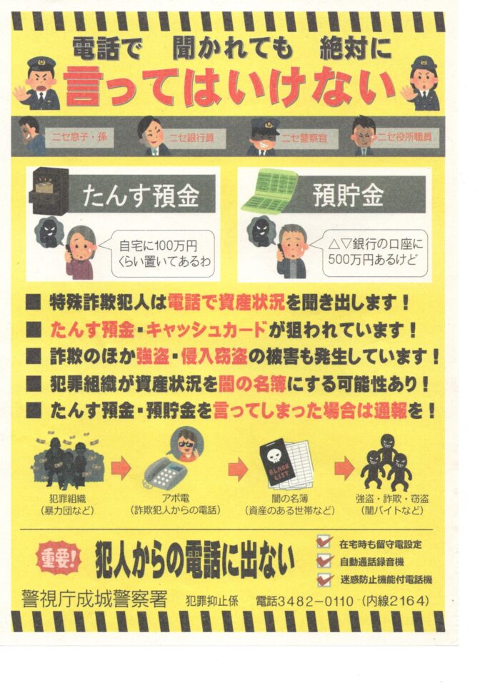 そして、忘れてはいけないのが、特殊詐欺による被害。近ごろの話題は、もっぱら詐欺被害撲滅です。どうしたら、詐欺被害を撲滅することが出来るでしょうか。中でも詐欺電話は、外国からかかってくることが多いようで、それをブロックするシステムがあるそうです。NTT東日本の特殊詐欺被害防止の取り組みも、もっと活用して欲しいそうです。警視庁防犯アプリ「デジポリス」もダウンロードして、ご自分や家族を、詐欺の被害から守りますしょう。そして、本当に怖いと思ったのは、自宅の固定電話や携帯電話あてに、警察官を名乗り、「あなたの口座が犯罪に使われている」とか、「あなたの携帯電話が不正に契約された」などと理由をつけて、現金をだましとったり、振り込ませたりする詐欺の手口です。警察官役の犯人は、「あなたは逮捕される」などと不安を煽ったり、偽の警察手帳や逮捕状を見せてくるケースもあります。警察官からの電話だと、すぐに信じてしまいそうですね。どんな電話でも、いったん切って、冷静に対処しましょう。