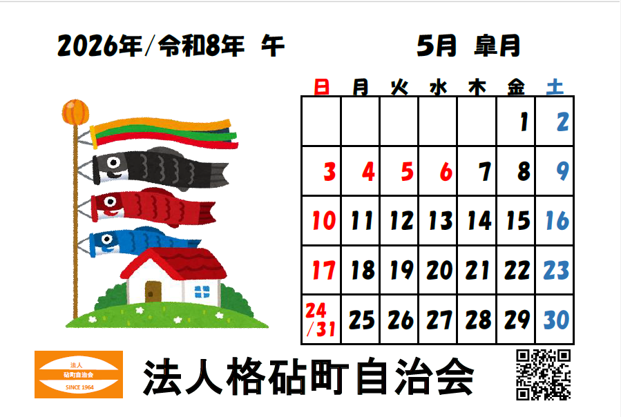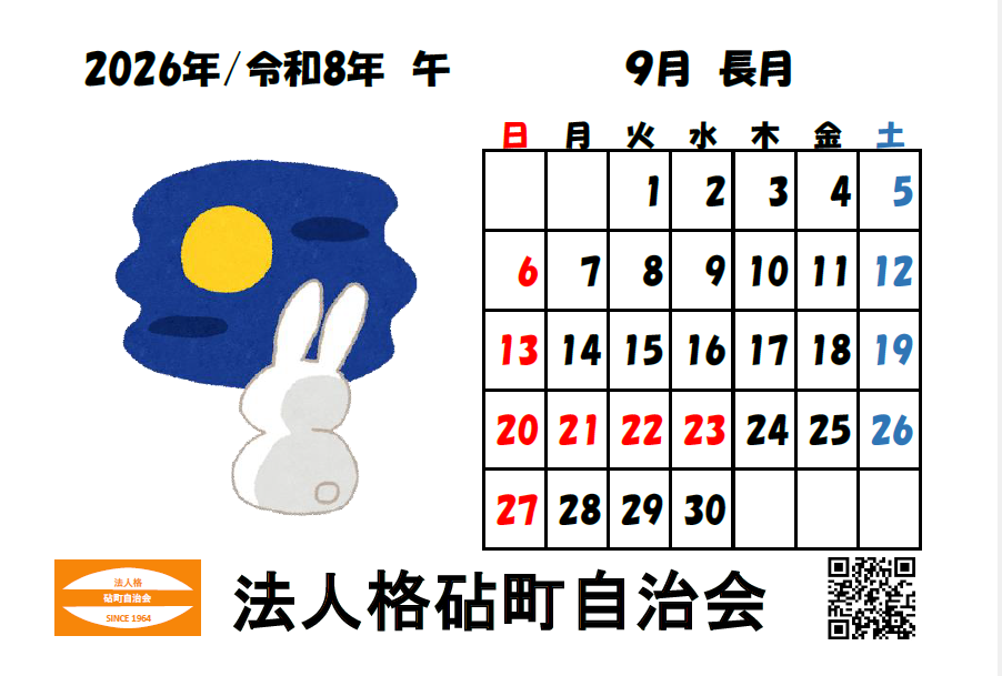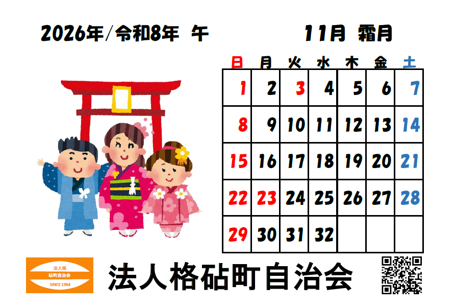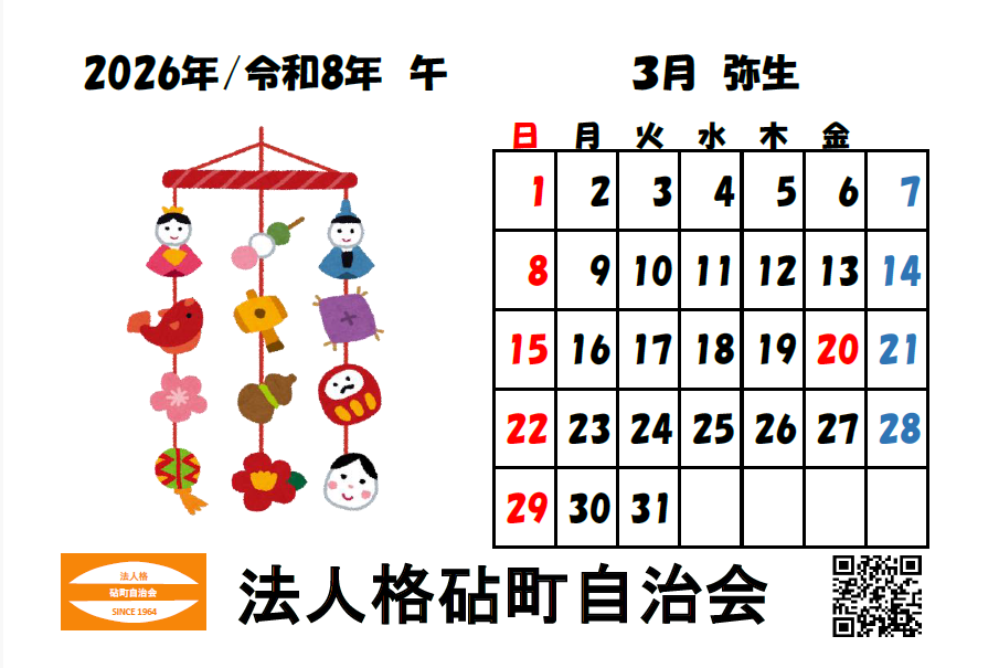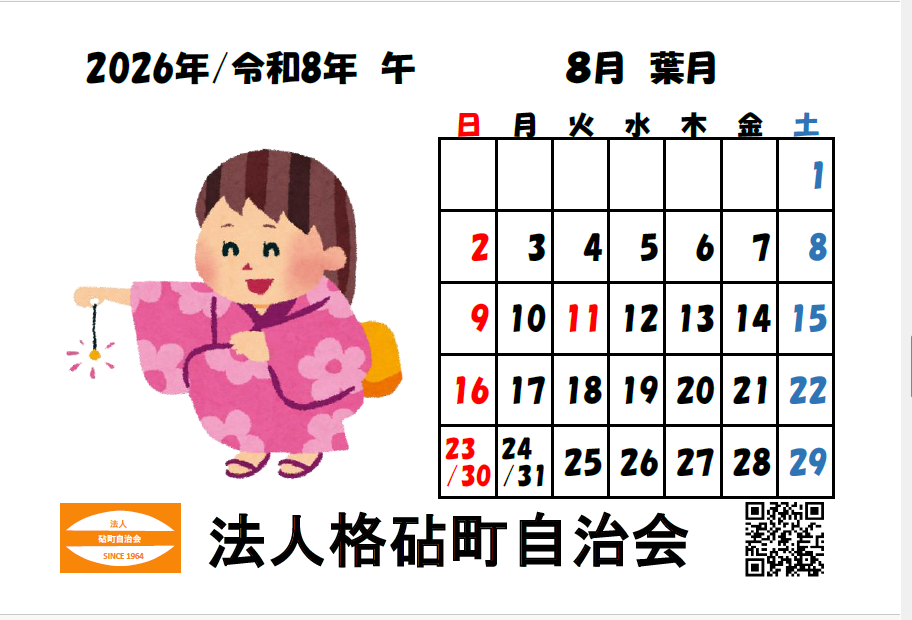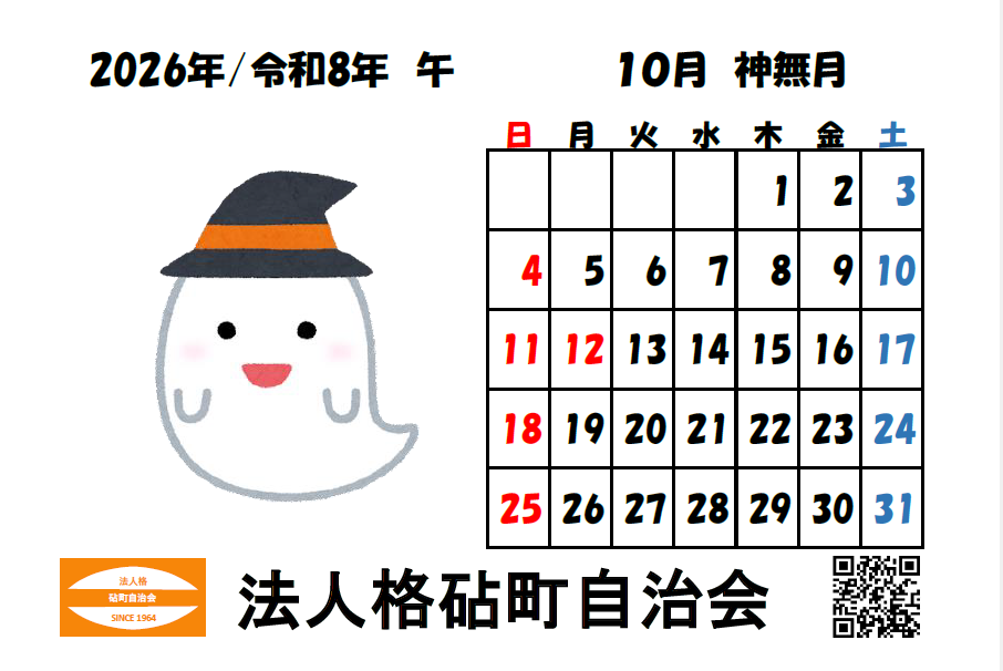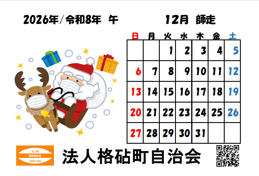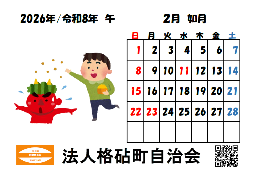 法人格 砧町自治会では毎年、関係のある団体・個人に、新年のご挨拶と共に、オリジナルカレンダーをお配りしています。その2026年版が完成いたしました。季節の行事や風景を盛り込んでいますが、一枚一枚見ていくと、この時期にはこんなイベントをやる予定だ!と意識いたします。来年も法人君(のりとくん)は、季節に合わせて変身いたします。1月はお正月の和服姿、2月は節分の鬼の姿。鬼の扮装は怖いと、子供達に評判が悪いのですが。