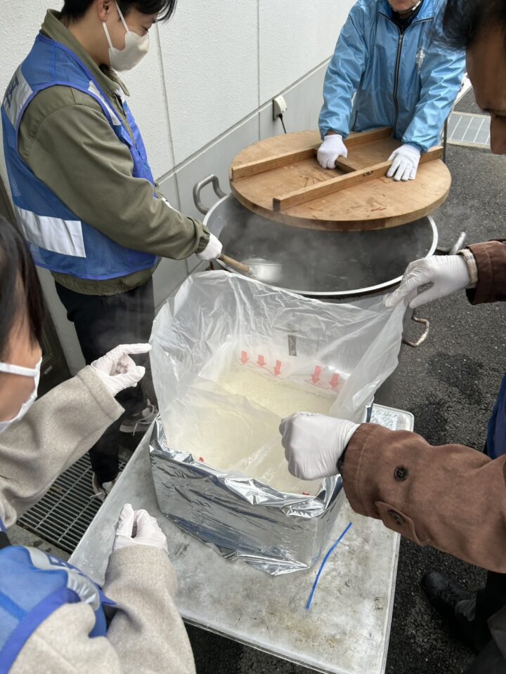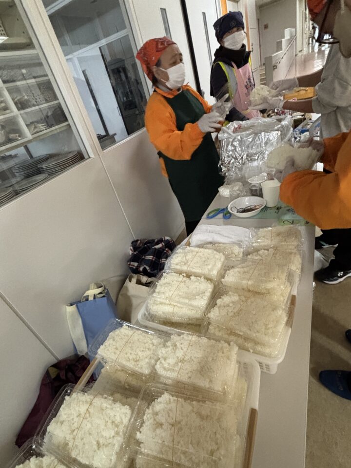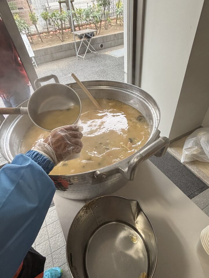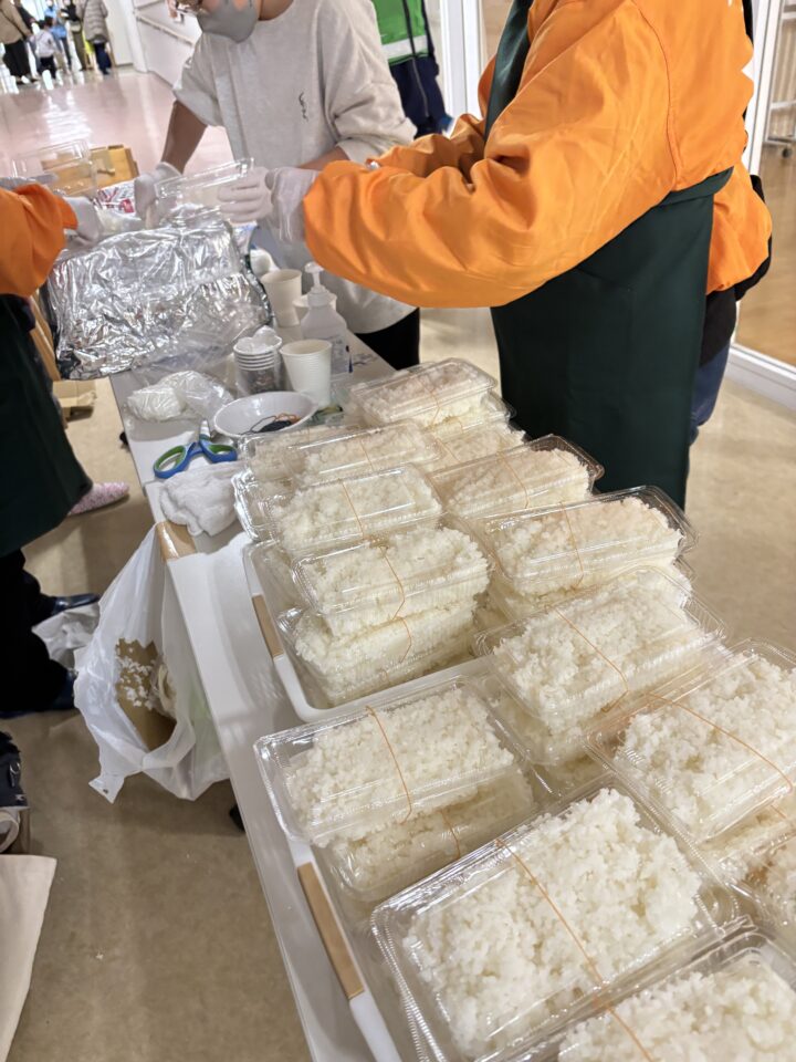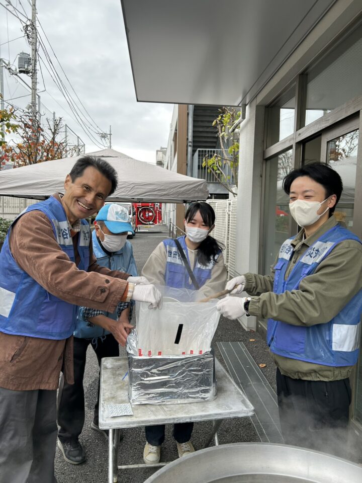煙トンネル、救命講習、スタンドパイプ体験、震度6体験コーナーなどさまざまなコーナーがある中、法人格 砧町自治会のメンバーの多くは、給食物資の炊き出しのコーナーの担当です。災害時の食料配布の訓練をしました。バーナーでお湯を沸かす。アルファ米にそのお湯を注いで、温かいご飯が完成。今回は、フードパックにご飯を盛り付けるだけではなく、アイラップ(ポリエチレンの袋)にご飯を入れて、おむすびにする方法も試してみました。温めずに食べられるレトルトのカレー、乾燥野菜がたっぷり入った味噌汁も提供されました。年々アルファ米がおいしくなっていて、驚きます。ごはん、味噌汁、レトルトカレー、こんなシンプルなメニューでさえ、災害時には、発災後3日目くらい経過してからでないと、提供できません。材料、燃料、マンパワーの3っつが揃わなければならないのです。どうしても、このようなデモをして困るのは、ややもすると、希望的観測が勝って、避難所に駆けつければ、すぐに食事が提供されると思われてしまうことです。もし、避難所に行くようなことになったなら、自分の食べる分の食料は、数日分持参するようにしましょう。