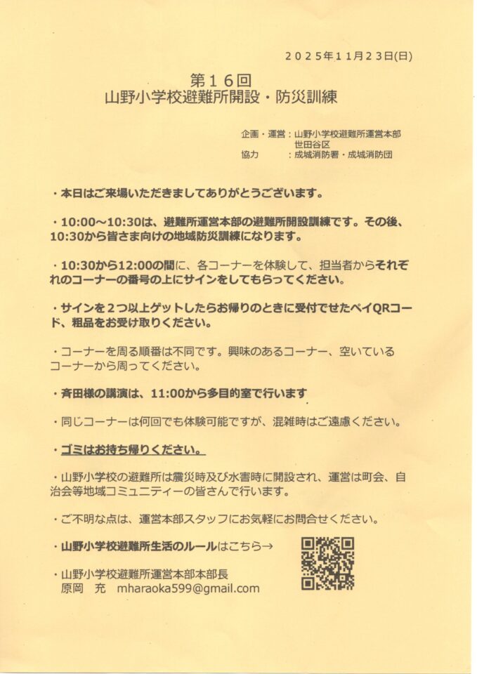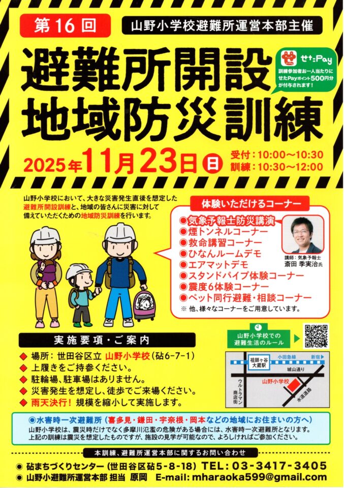 もうすでに16回目となる「避難所開設地域防災訓練」。11月23日(日)10時30分から12時まで、山野小学校で実施されました。短時間ではありましたが、内容が盛りだくさん。今回は155名の参加者を数え、一人あたり、「せたPay」500ポイントが付与されました。今回は多目的室で、気象予報士の斉田季節実治氏の防災講演もありました。この山野小学校は、災害時には避難所として開設されるので、参加なさった方は、その規模や備えに、イメージが湧いたのではないでしょうか。