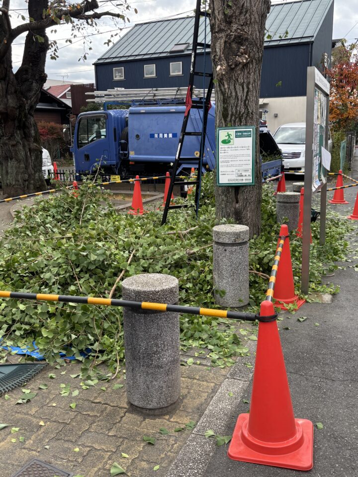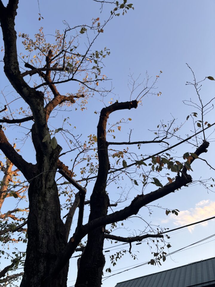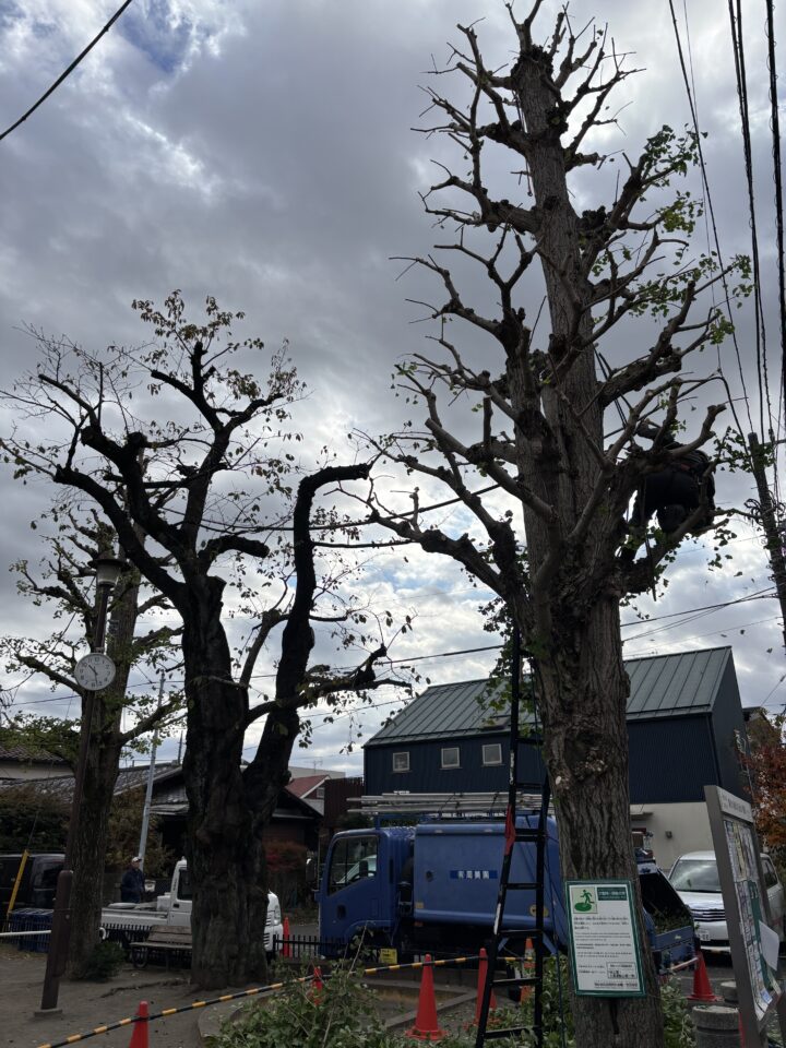 11月18日(火)法人格 砧町自治会の隣の、世田谷区立 砧六丁目公園(砧6-22-10)の、樹木の枝を落とす作業が行われました。住宅街にある、面積173㎡と、こじんまりとした公園なのですが、さくら、イチョウ、スギなどのりっぱな樹木がそびえたっています。本格的な冬を迎えるにあたって、枝払い・枝打ちが行われました。枝払い、枝打ち、剪定の3っつは、それぞれ意味が違うそうですが。この作業は、木の生育が落ち着いて、傷もつきにくくなるこの時期に行われます。日当たりや風通しを良くして健康状態を維持し、花つき・実つきを促進するものです。また、伸びすぎた枝や交差している枝葉などを切り落として、樹形を美しく整える目的もあります。全体の形を整えられて、見上げると、青い空が大きく広がって見えます。