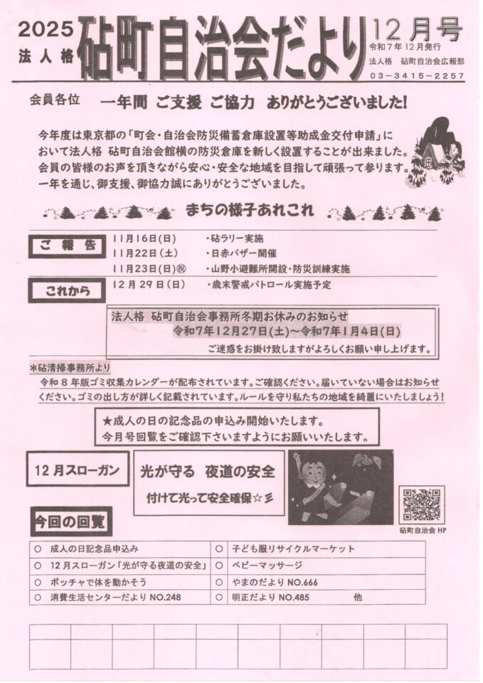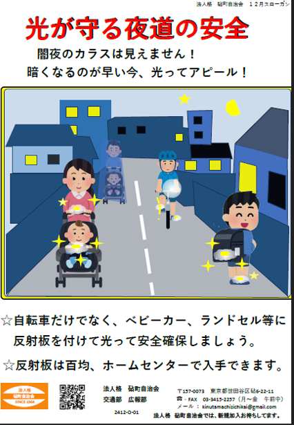 「一年間 ご支援 ご協力ありがとうございました。」のメッセージと共に、12月分の回覧板を発行いたしました。10日(水)にセット作業を終え、もうすぐ会員の皆さまのお手元に届くはずです。12月のスローガンは、「光が守る夜道の安全」といたしました。どうか、明るい服装、光る物を何か身に着けて、安全を確保いたしましょう。近頃は、お散歩中のワンちゃんも、光る首輪を着けていますね。そして、防災倉庫新設のお知らせと、法人格 砧町自治会事務所の冬季のお休みのお知らせも掲載しております。