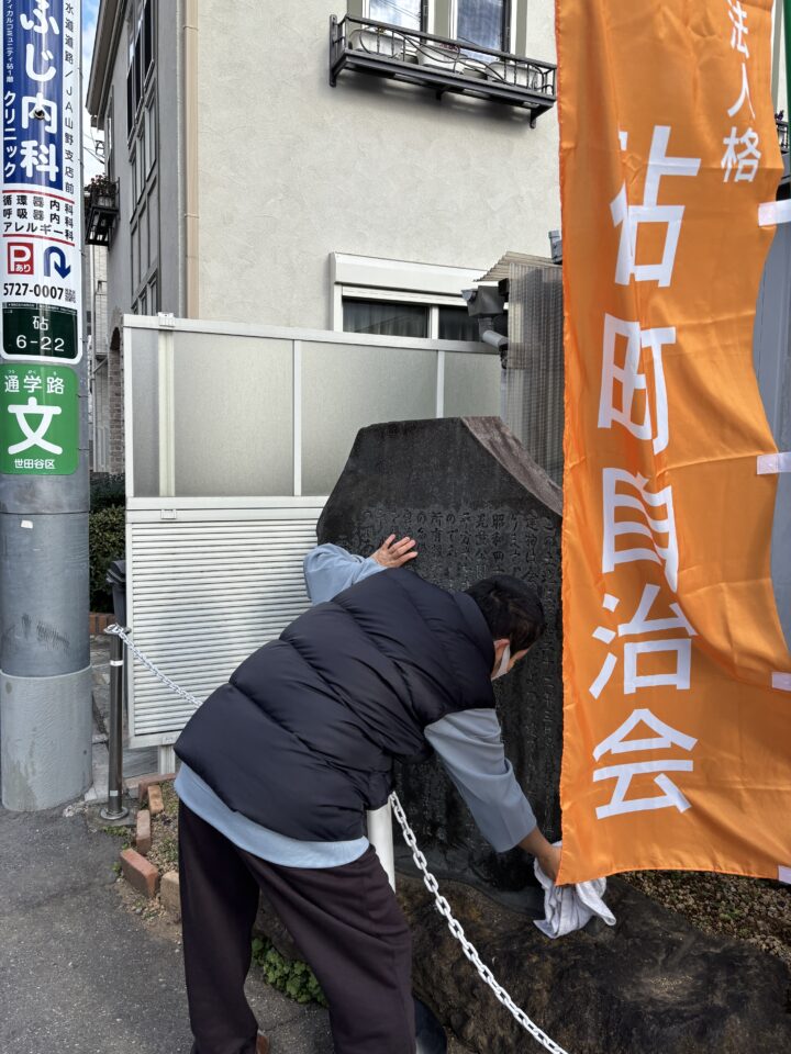 玄関前の一枚板の看板、法人格 砧町自治会の歴史が刻まれた石碑、丁寧い拭きあげていきます。会館の周りに植えられた樹木も、刈り揃えられて新年を迎えます。町の多くの人々をつなぐこの会館は、法人格を取得しているため、会員の皆さまのものなのです。気持ちよく整えられたこの会館を拠点に、来年も充実した活動を展開していくつもりです。(総務部 部長K)