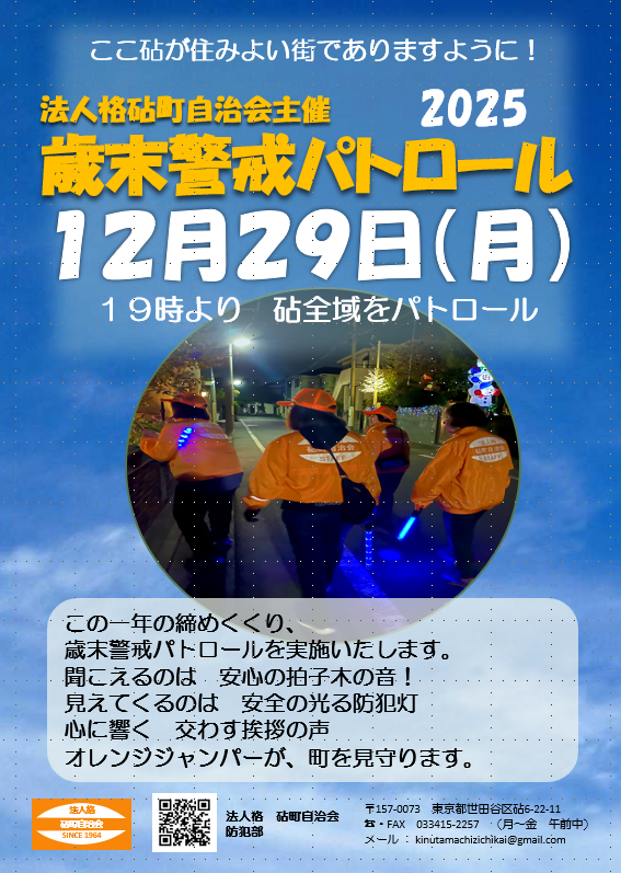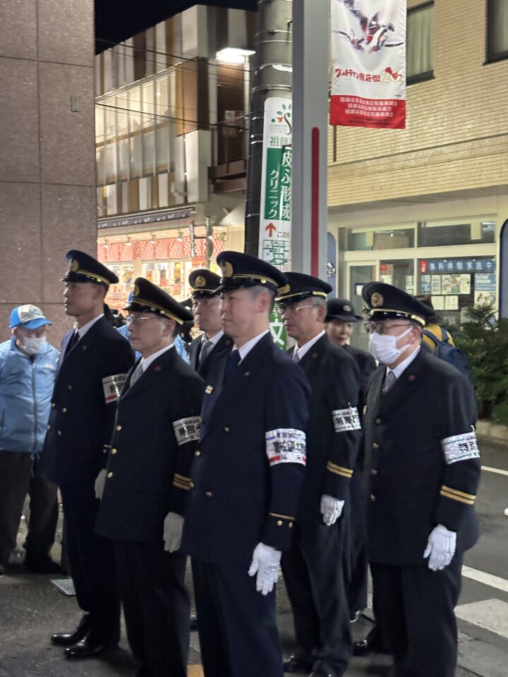 12月29日(月)2025年最後となるパトロール、「歳末警戒パトロール」を実施いたしました。その前に、18時50分より、成城消防団第五分団の団小屋前で、激励会が行われました。成城消防署署長よりの激励を受け、その後意気揚々と年の瀬の砧の町をパトロールいたしました。このパトロールには、成城警察署からも警察官が駆けつけて下さり、同行していただきました。今年も歳末警戒パトロールが無事の完了したことをご報告いたします。