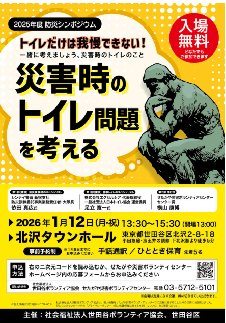 社会福祉法人世田谷ボランティア協会主催の、2025年度「防災シンポジュウム」に参加してきました。今回のテーマは「災害時のトイレ問題を考える」ということで、特に、長年災害時のトイレ問題に取り組んできた、法人格 砧町自治会にとっては、身近で興味深いものでした。1月12日(月・祝)に、北沢タウンホールで、13時30分より開催され、法人格 砧町自治会からは理事2名、サポーター1名が参加してきました。
