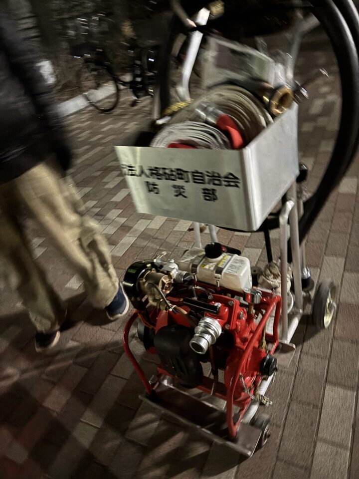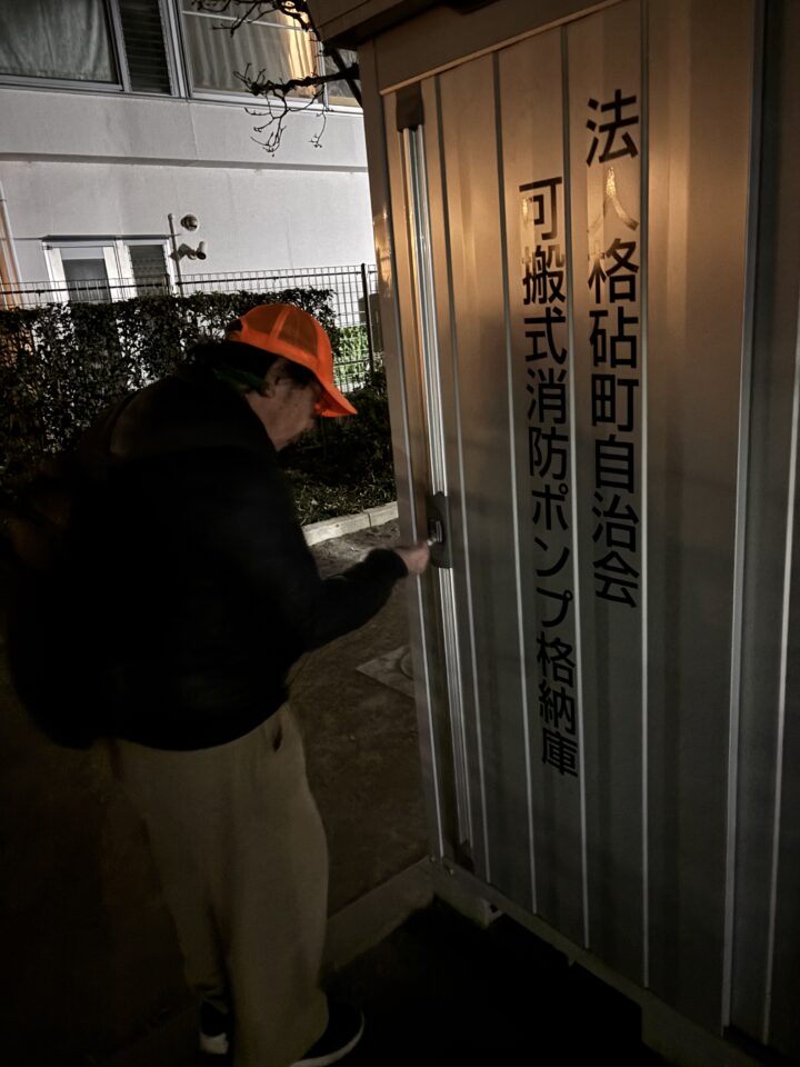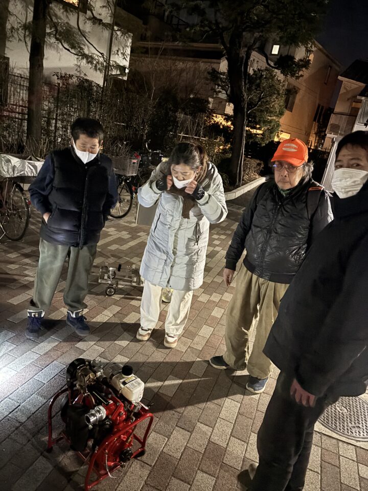 1月22日(木)20:00より、区立砧八丁目児童遊園(砧8-2-21)で、毎月定例のD級可搬式消防ポンプの 、操作訓練を行いました。繰り返し訓練することで、地域住民の防災スキルがアップします。今シーズン最強最長の大型寒波の予報が出ているこの時期、正直夜の8時の集合は厳しいものがあります。しかし、災害はいつ発生するかわかりません。地域住民が取り組むことのできる最大の消火能力を持つ、D級可搬式消防ポンプ!訓練は繰り返し、行わなくてはなりません。防災倉庫から取り出されたポンプ。その周りを、参加者が取り囲みます。