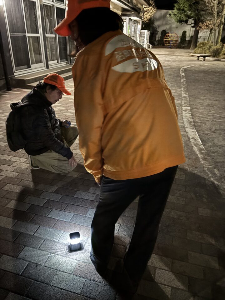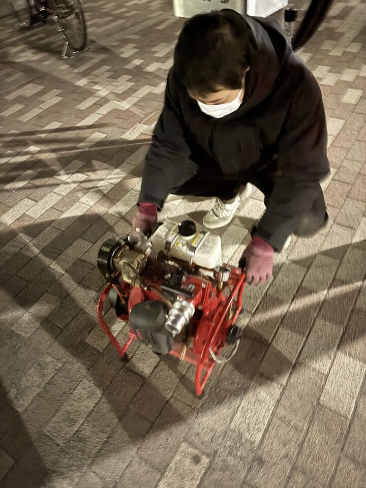 寒さもさることながら、エンジンがなかなかかからないことが、難儀です。この夜も、八丁目児童遊園に集合した理事、サポーター、商店街の役員が、代わる代わるエンジンをかけることにトライしました。予想に反して、気温3℃というこの寒さでも、割と短時間でエンジンは始動しました。月一回、砧八丁目児童遊園で第3木曜日に実施している、D型ポンプ練習会。少しづつではありますが、経験の積み重ねで、操作方法に自信生まれてきています。この夜も、ライトアップされたウルトラセブンに見守られ、訓練を完了いたしました。
