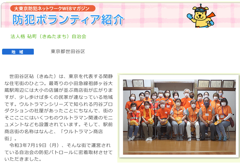 東京都防犯ネットワークは、防犯活動を支援する東京都のポータルサイトです。東京都の最新の防犯情報、防犯ボランティアの活動状況などを発信しています。法人格砧町自治会の防犯部は、その中の「防犯活動応援サイト」への投稿を遂次継続してまいりました。私共の記録であるとともに、他の団体の皆様の活動を知ることが出来る、貴重なツールとなっております。そのような経緯があったうえで、サイトへの投稿について、使い勝手について、今後の展開についてなど、取材に来てくださいました。インタビュアーの軽快なトークに、私共の緊張もほぐれ、日頃感じていること、要望、改善点など、かなり辛辣な意見も出ました。これらの意見について、今後改善を重ねてくださるとのことでした。より多くの方々に活動を知っていただくよう、引き続き独自の活動を投稿していこう思いました。