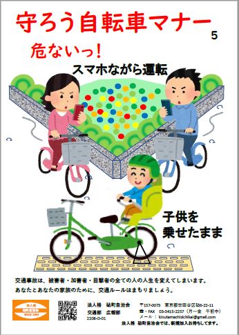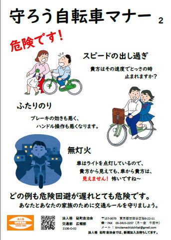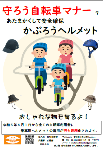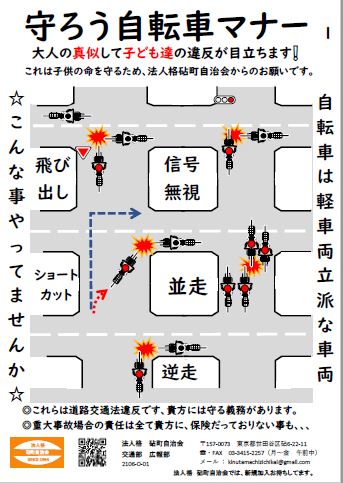 自転車の歴史は、約200年前からだとか。出始めは馬車を邪魔するものとして、また現代では、自動車側からすると危険極まりない邪魔者扱い。それでも、コロナ禍には、通勤に、宅配にと重宝がられました。自転車は、自分を縛る家から漕ぎ出すという意味で、女性解放という側面もあったようです。動力源は自分自身という、エコな乗り物。法人格砧町自治会は以前より、自転車の安全について、会員の皆さまと共に考えて、毎月ポスターも発行しています。自転車に、防犯ステッカー装着、自転車による夜間リンリンパトロールの活動も実施しています。これからも、身近で便利な自転車を、マナーを守って乗り続けたいものです。(総務部 部長K)