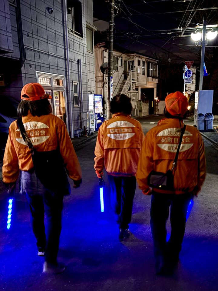 「安全、安心 安住の地 砧」は、 法人格砧町自治会の活動の大きな目標です。全ては、安全の上に成り立っています。安全あってこそ、安心して、いつまでもこの町で暮らそうとの想いが生まれます。防犯カメラの設置は、安全の「モノ」の取り組みです。パトロールは、直接的で効果的な活動です。複数人数で、ユニホーム着用の上、拍子木や、光る警棒を携帯して、町内を巡回します。これは「コト」の取り組みと言えます。そして、日常生活や、パトロールの時に、挨拶をかわし、声をかけあうことは、「ヒト」のつながりから生まれる、犯罪を防ぐ最強の手段と言えます。安全・安心は、この「モノ・コト・ヒト」の総合力によって成り立ちます。(防犯部 部長S)