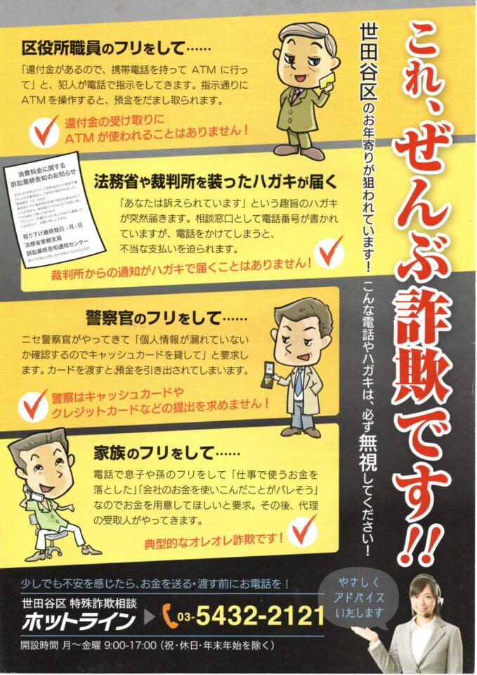 詐欺(サギ)はどこからでも飛んできます。電話で、メールで、マッチングアプリやSNSで、チラシで、ハガキで、直接訪問で。様々な事例から学び、「これって、もしかして詐欺では!」と気づくようにしましょう。「自分は騙されない!」と思っている人ほど、騙されやすいそうです。騙されやすさは、だれでも同じです。、この防犯対策講座に参加して、だましの手口の予備知識を学習して、詐欺被害からご自分とご家族を守りましょう。デジポリスの紹介もありますので、スマホをご持参ください。なお、ご参加くださった会員の皆さまには、せたペイポイントが付与されます。