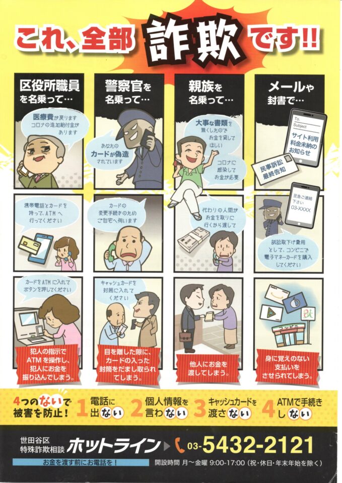 法人格砧町自治会主催の、会員研修会です。2月28日(土)10:00より、法人格砧町自治会会館にて実施いたします。今回は、詐欺に関しての話題にフォーカスして、開催いたします。なんと昨年2025年の、特殊詐欺被害は27.758件、前年比の1.6倍に上ったそうです。特殊詐欺被害の多い地域は、ダントツで東京都です。中でも不名誉なことに、世田谷区です。個人金融資産約2千兆円のうち、約6割を高齢者が持っているということで、なぜか高齢者ばかりが騙されている印象ですが、若い世代の被害も多くなっているそうです。その被害の入り口は、インスタグラム、ユーチューブ、 などだそうです。次々と新手の詐欺が現れます。