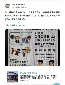 そんな取り組みに賛同して、法人格砧町自治会からも情報発信をすることにいたしました。その第一弾として、2月28日(土)に開催する、「実践防犯対策講座」をご案内いたしました。特殊詐欺の実態と、それを防ぐ防犯アプリを紹介します。参加のお申し込みは、当自治会事務所まで、お願いいたします。