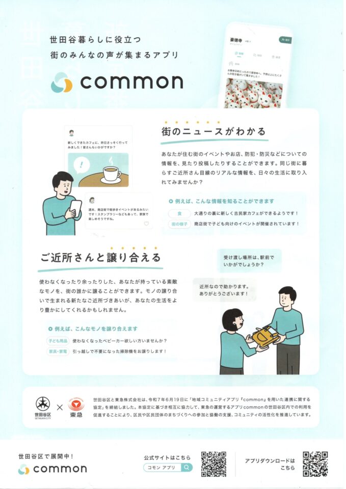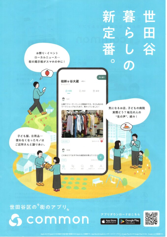 これにより、従来の回覧板、掲示板、ホームページと、さらにこのcommonが加わり、法人格砧町自治会発信の情報が、広く皆様にお届けできるようになりました。ぜひ皆さまも、身近なまちの情報が得られるアプリ「common」をご活用ください。(広報部 部長K)