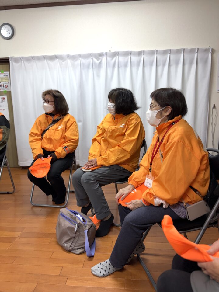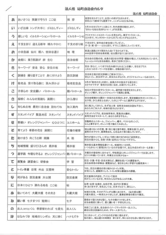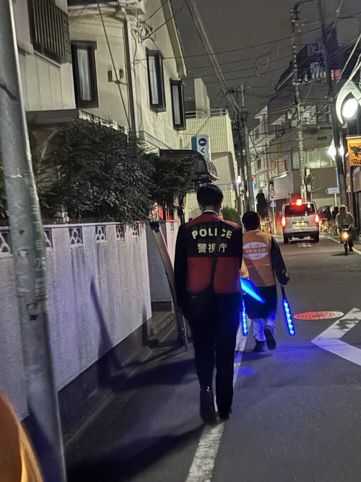 自治会有志で作成した防犯カルタ、パトロールのポスターや、自転車に装着する防犯ステーカーも見ていただきました。オレンジジャンパーと帽子、光る警棒、拍子木と、準備万端。聞き取りや集合写真撮影の後、夜の砧の町を一緒にパトロール。つい先日「実践防犯対策講座」で講師を務めてくださった、生活安全課防犯係の斉藤係長も同行してくださいました。