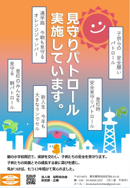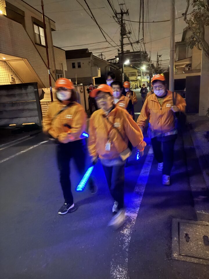 一般の地域住民が出来るのは、見せる(魅せる?)パトロールです。また、車両を使ってのパトロールと違い、丹念に徒歩で町の隅々を巡回するこのスタイルが、犯罪抑止力になっていると思います。加えて、道行く人々と交わす挨拶も、とても重要な意味を持ちます。守っている、守られている!この双方向の思いが、町の安全と安心を維持しています。地域住民のパトロール活動は、顔の見える関係が築かれることで、不審者の抑止効果も期待できます。徒歩で地域内をきめ細かく巡回することで、夜間の危険個所の確認や、防犯灯の点検も兼ねています。これからも地域全体で、安心・安全な環境づくりを続けていきたいものです。(防犯部 部長S)