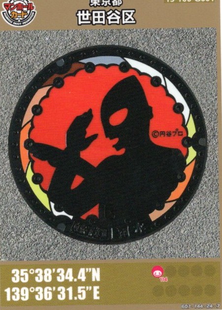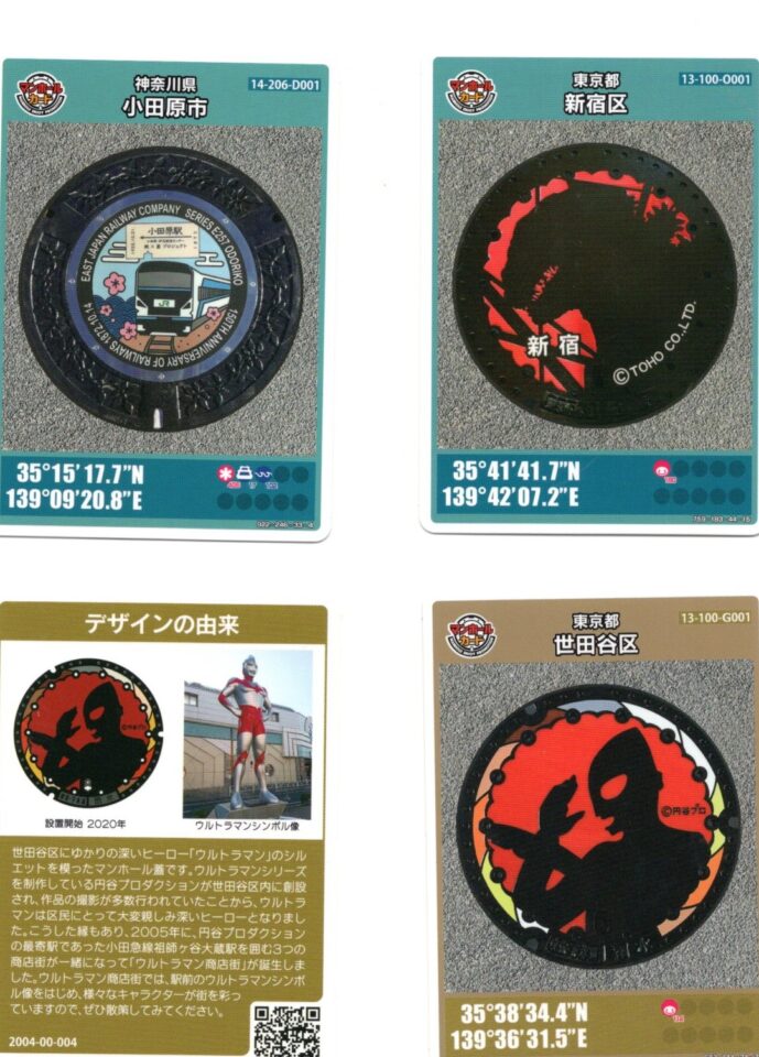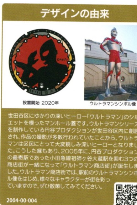 このマンホールカードの登場は、2016年ごろだそうです。御朱印を集めるように、マンホールカードを収集している方も多いようです。2020年に、祖師ヶ谷大蔵駅周辺に設置されたのマンホール5基のうち、カードになっているのは、このウルトラマンです。マンホールは直接見ることが出来ますが、マンホールカードは、三軒茶屋観光案内所でしか、手に入れることはできません。