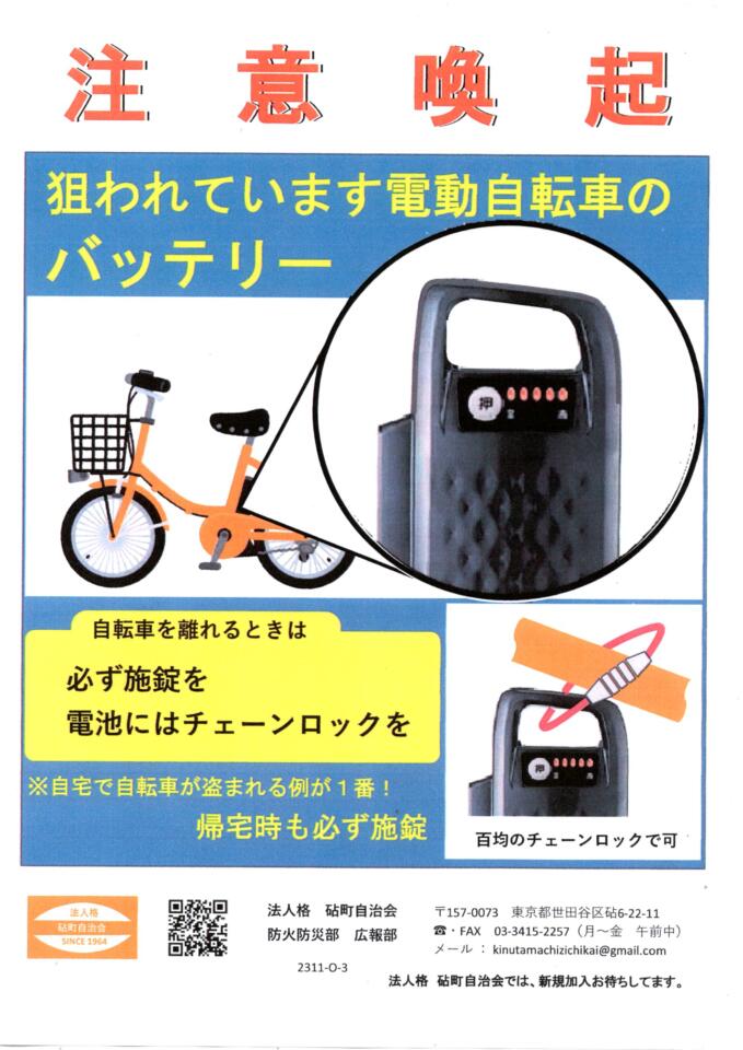 令和5年中、都内において電動アシスト自転車のバッテリー盗難事案が、9月末で333件と増加傾向にあるそうです。電動自転車のバッテリーは、一般的に寿命は3~4年で定期的な交換が必要なため、需要が高く、ネット上で転売されているそうです。買い替えると3~6万円するという自転車の心臓部です。対策としては、確実なロック、二重ロック、帰宅後や会社に着いた時には室内に持ち込むなどが考えられます。ワイヤー鍵をバッテリーの取っ手部分に通し、車体や駐輪場の柱に括り付ける方法もあります。自転車カバーをかけるのも一案です。盗むのに時間がかかることを泥棒は嫌がります。被害を防ぐため、駐輪場は管理人が常駐しているところや、防犯カメラが設置してあるところを選びましょう。
